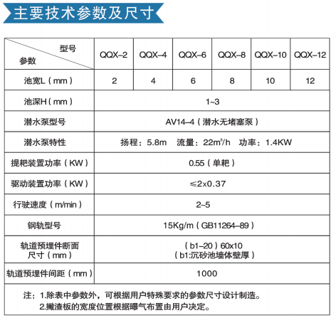 QQX系列移动式桥式吸沙机由主梁、驱动装置、潜污泵、撇渣装置、轨道和控制箱等组成。吸沙机在置于池顶的钢轨.上根据设定的周期自动往返运行,将池底部砂水混合液提升并排至池边的集水渠。当顺水流行驶时,撇渣耙下降刮集浮渣并送至池末端的渣槽;反向行驶时,撇渣耙提升,离开液面以防浮渣逆行。
