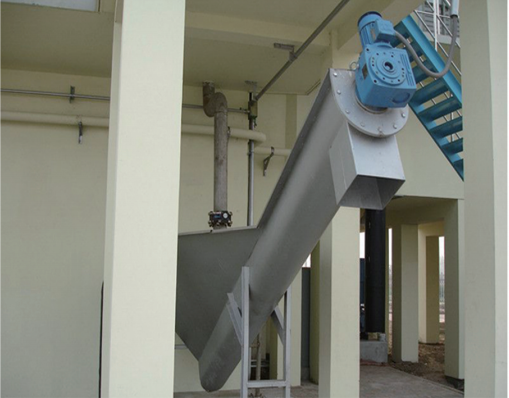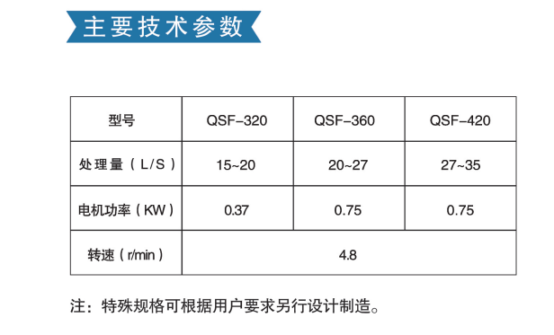 QSF型螺旋式砂水分离器是由无轴螺旋、衬条、U形槽、水箱、导流板和驱动装置等组成。工作过程:砂水混合液从分离器一端输入顶部的水箱,混合液中比重较大的颗粒如砂粒等将沉积于U形槽底部。在螺旋的推动下,砂粒沿斜置的U形槽底提升,离开液面后继续推移一段距离,在砂粒充分脱水后经排砂口卸至盛砂桶,而与砂分离的水则从溢流口排出并送往厂内进水池。