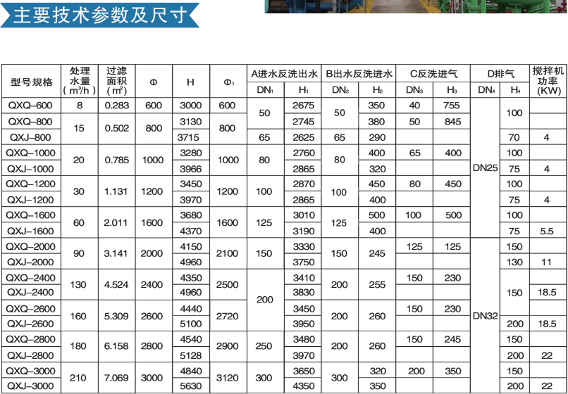 QXQ(J)型高效快速纤维球过滤器系列产品为钢制圆形罐体,采用纤维球为过滤介质。按反冲洗方式不同分气水反冲洗( QXQ )及机械搅拌水反冲洗( QXJ)型两种形式,具有: