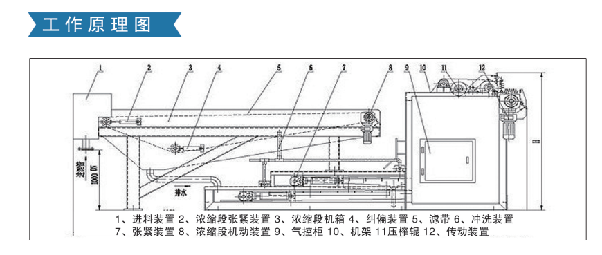 QDY型带试污泥浓缩脱水-体机主要由机架、动力传动装置、重力脱水、预压脱水、上下滤带、布料装置、滤带冲洗装置、系列压辊、导向棍、滤饼卸料装置、机器自动保护装置、气动控制柜、电气控制柜等组成。