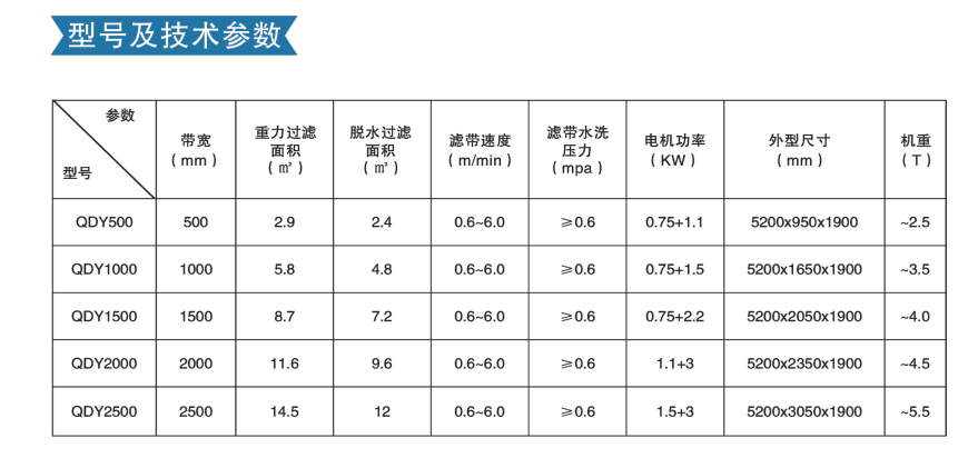 QDY型带式污泥浓缩脱水一体机是一种把污水处理过程中浓缩的污泥(含水率95-98%)进一步脱水而成泥饼(含水率60- -80% )的有效设备。与其它过滤机相比,更适合污水处理厂配套使用,它具有连续运行、无极调速、滤带自动纠偏、自动冲洗等特点,并可以更换。