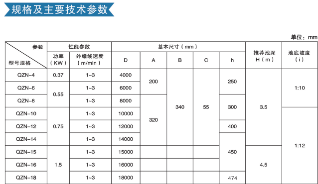 QZN型轻型中心传动浓缩机采用蜗杆传动(D>16m采用中心回转齿轮),刮泥臂上设有纵向搅拌栅条,刮臂旋转时栅条起搅拌作用,加速活性污泥的下沉,刮泥板外缘线速度≤3m/min,整个刮泥机构可以手动调节.上下高度+50mm。